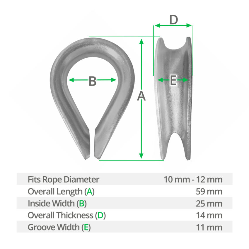 £0.19 inc. VATMaterial : Stainless steelFits Rope Diameter : 2mm-4mmOverall Length (A) : 21mmInside Width (B) : 7mmOverall Thickness (D) : 5mmGroove Width (E) : 3mmRope Thimble : x1Hard Eye Splice : YesProtects rope from abrasion : YesUse with Natural Rope : YesUse with Synthetic Rope : YesUse with Wire Rope & Cables : YesEase of Use : EasyTools Required : NoneAccessories Required : Rope GripsAttach to Rope : Rope GripsColour : GreyHandling : Hard & smoothSuited to Indoor Use : YesSuited to Outdoor Use : YesCorrosion Resistant : YesUV Resistant : YesCan Withstand Salt Water : Yes£4.97 inc. VATMaterial : Stainless steelFits Rope Diameter : 20mm-22mmOverall Length (A) : 105mmInside Width (B) : 47mmOverall Thickness (D) : 27mmGroove Width (E) : 22mmRope Thimble : x1Hard Eye Splice : YesProtects rope from abrasion : YesUse with Natural Rope : YesUse with Synthetic Rope : YesUse with Wire Rope & Cables : YesEase of Use : EasyTools Required : NoneAccessories Required : Rope GripsAttach to Rope : Rope GripsColour : SilverHandling : Hard & smoothSuited to Indoor Use : YesSuited to Outdoor Use : YesCorrosion Resistant : YesUV Resistant : YesCan Withstand Salt Water : Yes£0.91 inc. VATMaterial : Stainless steelFits Rope Diameter : 10mm-12mmOverall Length (A) : 59mmInside Width (B) : 25mmOverall Thickness (D) : 14mmGroove Width (E) : 11mmRope Thimble : x1Hard Eye Splice : YesProtects rope from abrasion : YesUse with Natural Rope : YesUse with Synthetic Rope : YesUse with Wire Rope & Cables : YesEase of Use : EasyTools Required : NoneAccessories Required : Rope GripsAttach to Rope : Rope GripsColour : SilverHandling : Hard & smoothSuited to Indoor Use : YesSuited to Outdoor Use : YesCorrosion Resistant : YesUV Resistant : YesCan Withstand Salt Water : Yes£0.55 inc. VATMaterial : Galvanised steelFits Rope Diameter : 8mm-10mmOverall Length (A) : 50mmInside Width (B) : 18mmOverall Thickness (D) : 12mmGroove Width (E) : 9mmRope Thimble : x1Hard Eye Splice : YesProtects rope from abrasion : YesUse with Natural Rope : YesUse with Synthetic Rope : YesUse with Wire Rope & Cables : YesEase of Use : EasyTools Required : NoneAccessories Required : Rope GripsAttach to Rope : Rope GripsColour : SilverHandling : Hard & smoothSuited to Indoor Use : YesSuited to Outdoor Use : YesCorrosion Resistant : YesUV Resistant : YesCan Withstand Salt Water : No