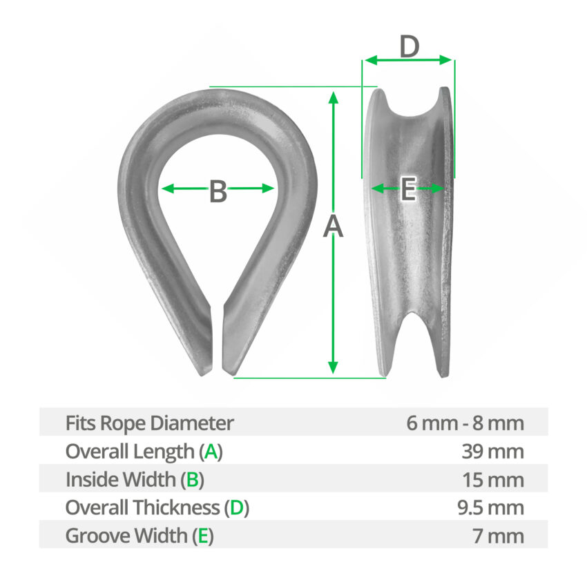 £0.55 inc. VATMaterial : Galvanised steelFits Rope Diameter : 8mm-10mmOverall Length (A) : 50mmInside Width (B) : 18mmOverall Thickness (D) : 12mmGroove Width (E) : 9mmRope Thimble : x1Hard Eye Splice : YesProtects rope from abrasion : YesUse with Natural Rope : YesUse with Synthetic Rope : YesUse with Wire Rope & Cables : YesEase of Use : EasyTools Required : NoneAccessories Required : Rope GripsAttach to Rope : Rope GripsColour : SilverHandling : Hard & smoothSuited to Indoor Use : YesSuited to Outdoor Use : YesCorrosion Resistant : YesUV Resistant : YesCan Withstand Salt Water : No£0.99 inc. VATMaterial : Stainless steelFits Rope Diameter : 6mm-8mmOverall Length (A) : 39mmInside Width (B) : 15mmOverall Thickness (D) : 9.5mmGroove Width (E) : 7mmRope Thimble : x1Hard Eye Splice : YesProtects rope from abrasion : YesUse with Natural Rope : YesUse with Synthetic Rope : YesUse with Wire Rope & Cables : YesEase of Use : EasyTools Required : NoneAccessories Required : Rope GripsAttach to Rope : Rope GripsColour : SilverHandling : Hard & smoothSuited to Indoor Use : YesSuited to Outdoor Use : YesCorrosion Resistant : YesUV Resistant : YesCan Withstand Salt Water : Yes£0.59 inc. VATMaterial : Stainless steelFits Rope Diameter : 4mm-6mmOverall Length (A) : 27mmInside Width (B) : 11mmOverall Thickness (D) : 7mmGroove Width (E) : 5mmRope Thimble : x1Hard Eye Splice : YesProtects rope from abrasion : YesUse with Natural Rope : YesUse with Synthetic Rope : YesUse with Wire Rope & Cables : YesEase of Use : EasyTools Required : NoneAccessories Required : Rope GripsAttach to Rope : Rope GripsColour : SilverHandling : Hard & smoothSuited to Indoor Use : YesSuited to Outdoor Use : YesCorrosion Resistant : YesUV Resistant : YesCan Withstand Salt Water : Yes