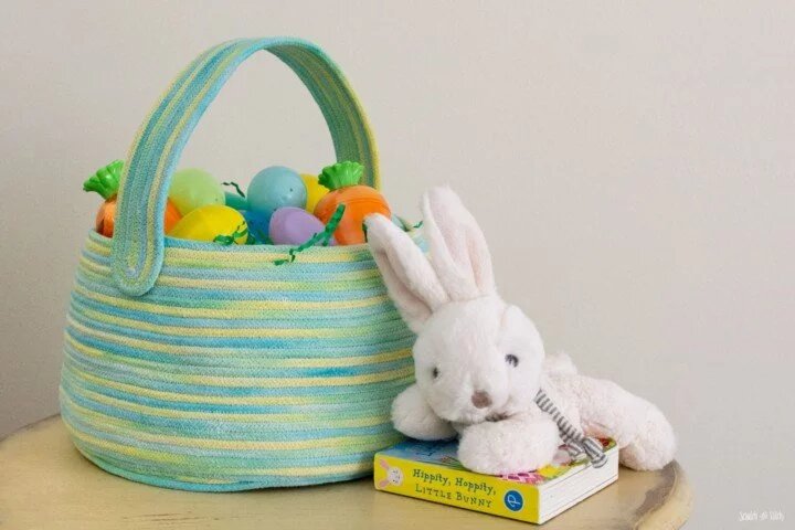 Another cute Easter basket craft is the work of Cathi from Scratch and Stitch. She used a home-dyed clothesline and a sewing machine to achieve the beautiful result shown in the photo. And once Easter is over, you can store the little ones’ toys in it!